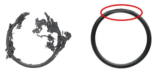 從外觀來看,O形圈的損壞有多種形式,請觀察一下O形圈是否有異乎尋常的地方。比如是否有缺失?是否有磨損?O形圈是否被擠壓和/或變形?這些問題很細(xì)微,需要仔細(xì)觀察。圖3顯示了O形圈明顯損壞和不明顯損壞兩種情況。