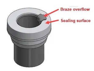 釬焊是一項(xiàng)復(fù)雜的操作,可能會導(dǎo)致密封面上出現(xiàn)焊渣溢流。由于密封面被破壞,就可能造成鋼管螺母處的泄漏。焊條熔化時產(chǎn)生的熱量使密封面位置可能產(chǎn)生焊渣溢流,焊條融化液會流向更高溫度的地方。一旦發(fā)生融化液溢流,應(yīng)立即轉(zhuǎn)移到襯套的小直徑端進(jìn)行焊接,使融化液均勻流過接頭。如果發(fā)現(xiàn)釬焊溢流,裝配前請取下受影響的襯套,然后在該位置處重新釬焊一個新的襯套。