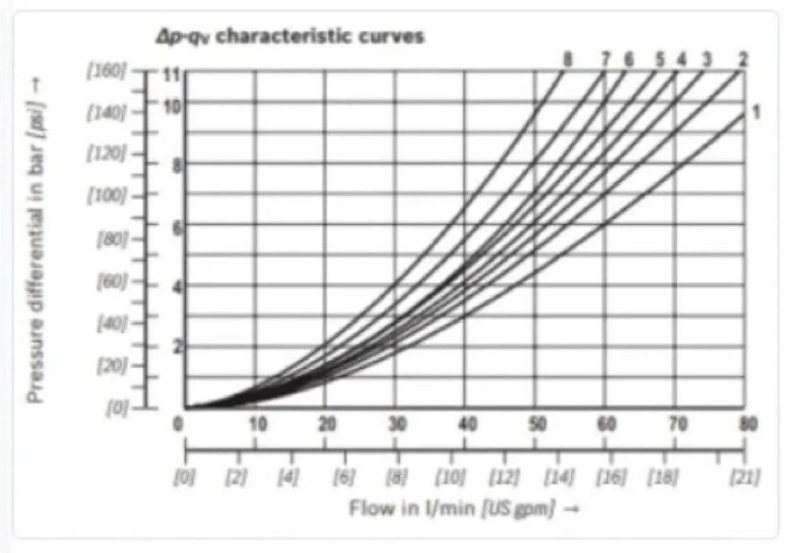 所有閥門都有不同的流動(dòng)通道和流體方向變化,這將在特定流量下產(chǎn)生一定的壓降。這些壓降因不同的閥芯類型而異,這對于控制能源效率并確保負(fù)載有足夠的可用壓力非常重要。