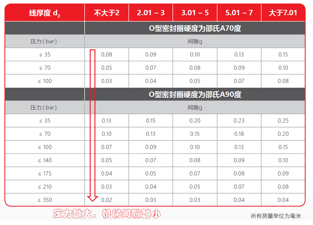 而機(jī)械間隙又取決于公差配合的選擇,加工工藝,裝配工藝等因素。除此之外,密封面間隙的壓力也是很關(guān)鍵的因素。下面給出O型圈線(xiàn)徑、所受壓力、機(jī)械間隙、硬度四者之間的關(guān)系表,可供設(shè)計(jì)時(shí)參考。粗略的看,總的設(shè)計(jì)原則就是——壓力越大,機(jī)械間隙就要越小。